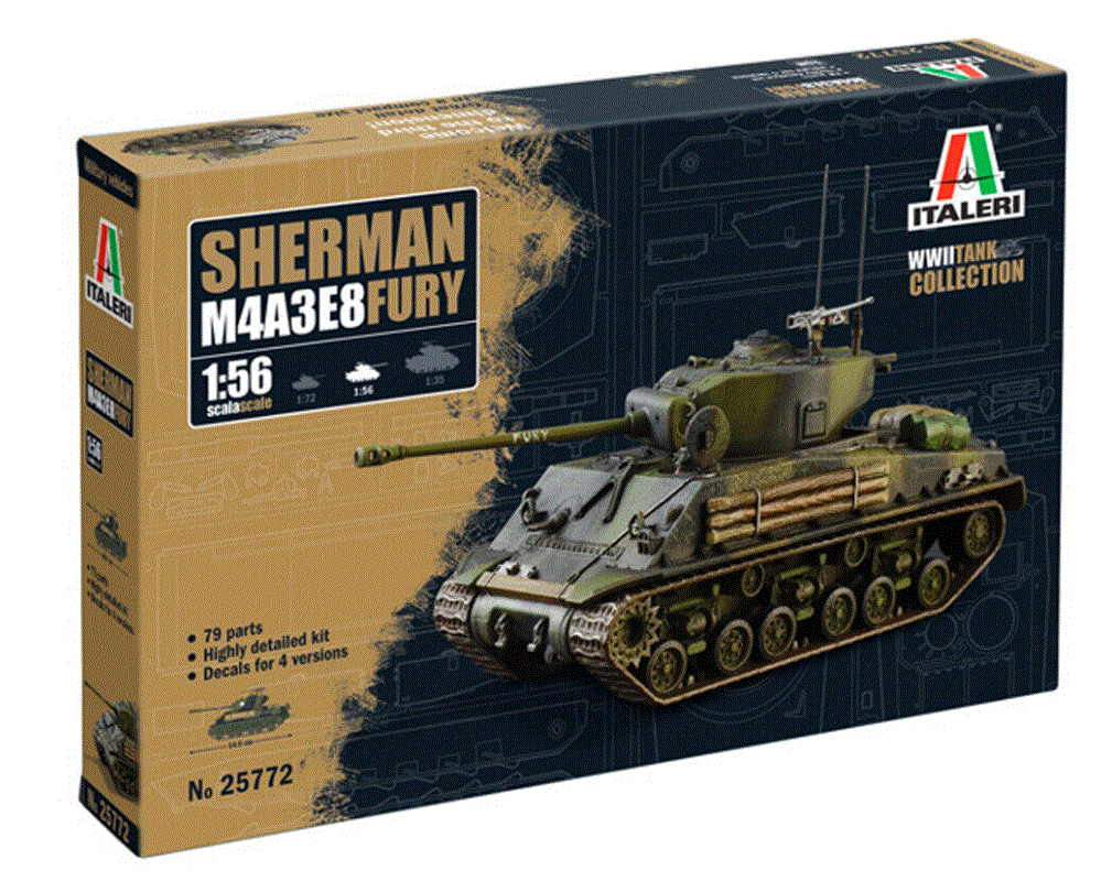 Italeri W25772 1/56 M4A3E8 Sherman Fury WWII Tank Collection Model Kit